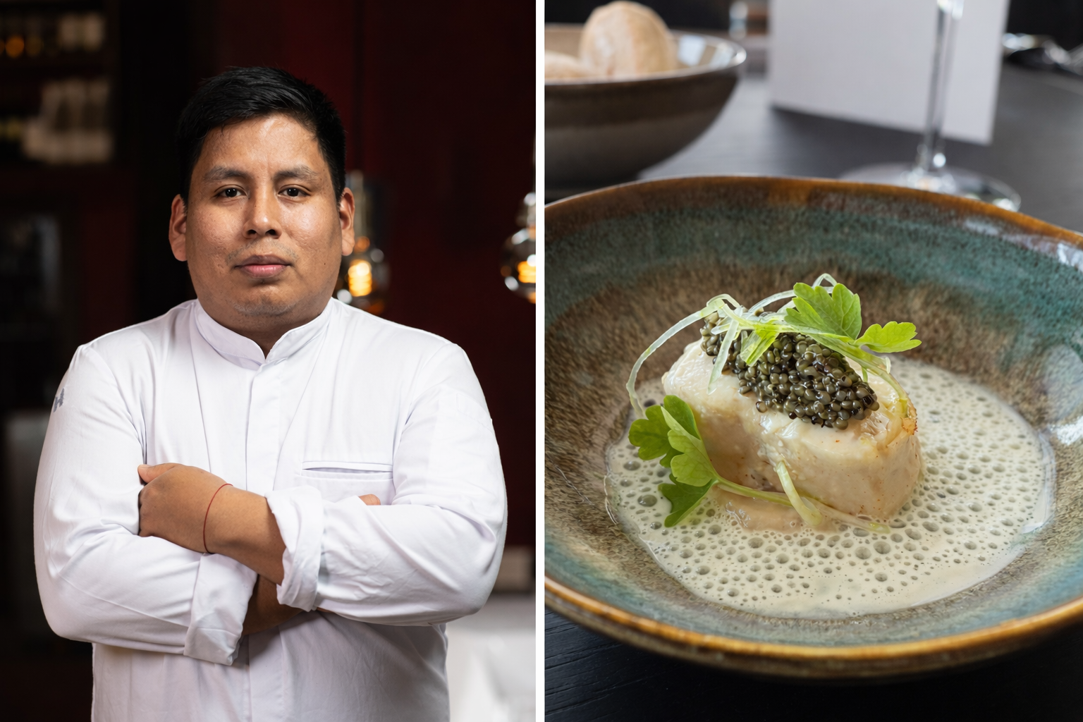Mit seinem unverwechselbaren Stil präsentiert er ein Signature Dish, das kulinarische Welten verbindet: italienischer Stör mit peruanischen Kartoffeln, Sellerie und Tomburi – eine raffinierte Komposition voller Aromen und Handwerkskunst.