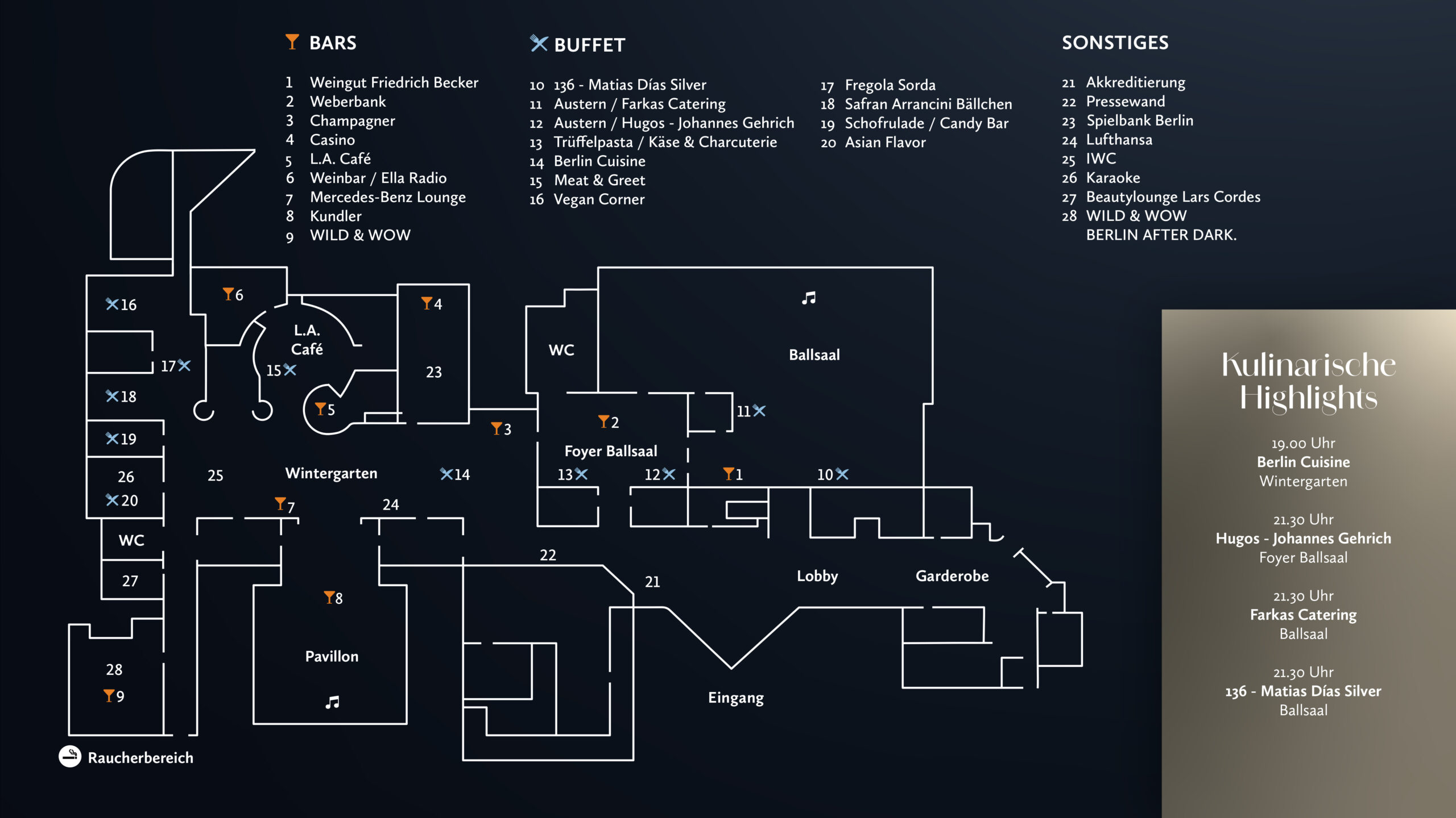 Das Dinner im Ballsaal sowie das Buffet im Pavillon beginnen jeweils um 19 Uhr.