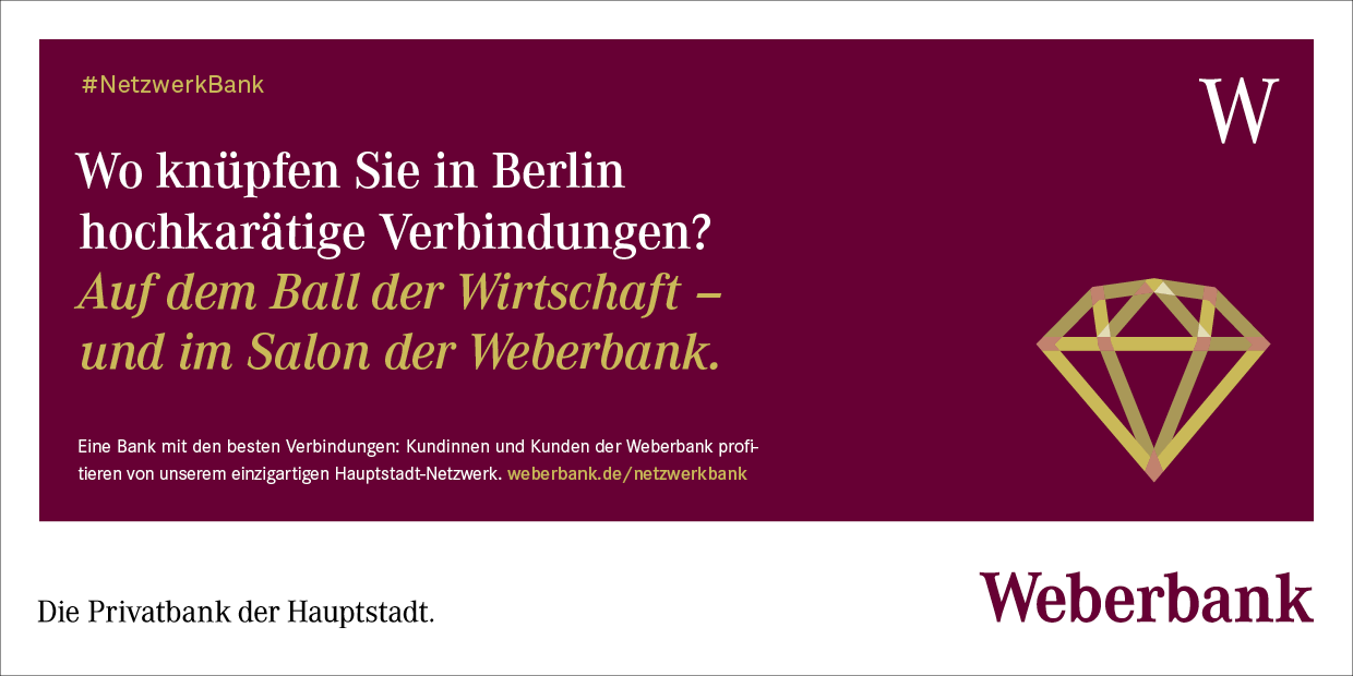 Mit unserer langjährigen Premiumpartnerschaft mit dem VBKI verfolgen wir gemeinsam das Ziel, die Hauptstadtregion zu stärken. Als Bank mit den besten Verbindungen versteht sich die Weberbank als erweitertes Netzwerk für ihre Kundinnen und Kunden. Und wo lässt es sich besser hochkarätige Kontakte in der Hauptstadt knüpfen als beim „Ball der Wirtschaft“ des VBKI.